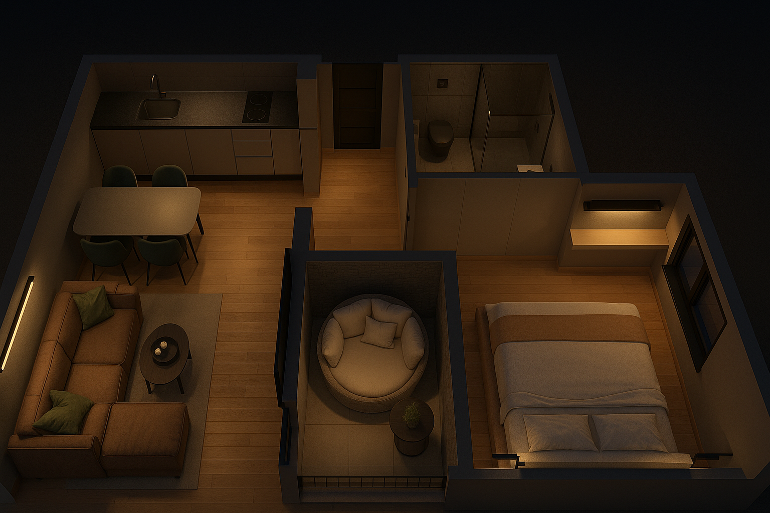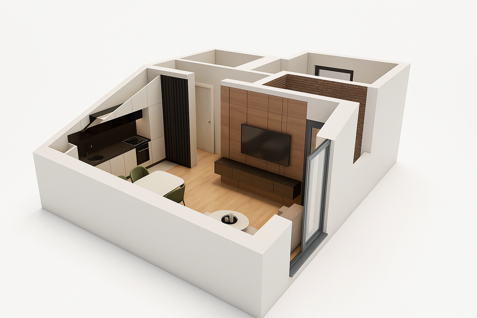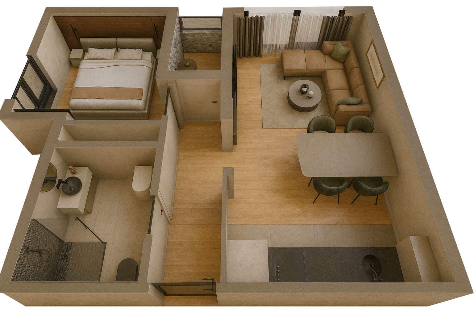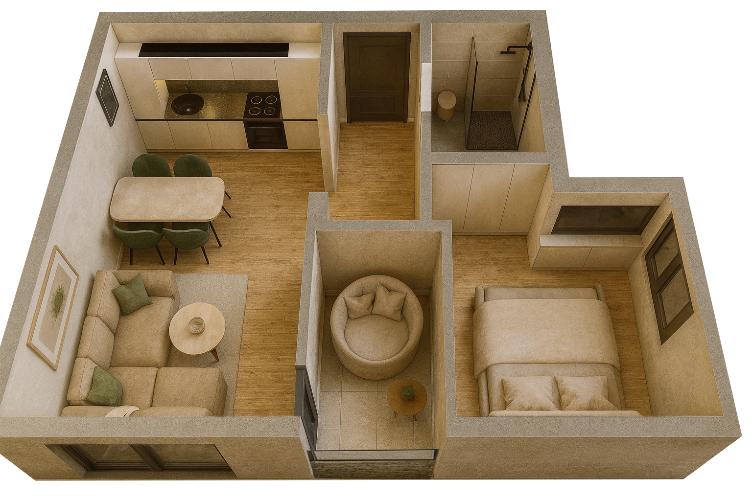Dom koji odiše svetlom i toplinom. Zamišljen da bude utočište mira, ovaj dvosoban stan odiše prijatnom atmosferom i praktičnim rasporedom prostorija. Svetla dnevna soba povezana je sa trpezarijom i izlazom na terasu – savršen kutak za jutarnju kafu. Udobna spavaća soba i moderno uređeno kupatilo pružaju potpun komfor za svakodnevni život.